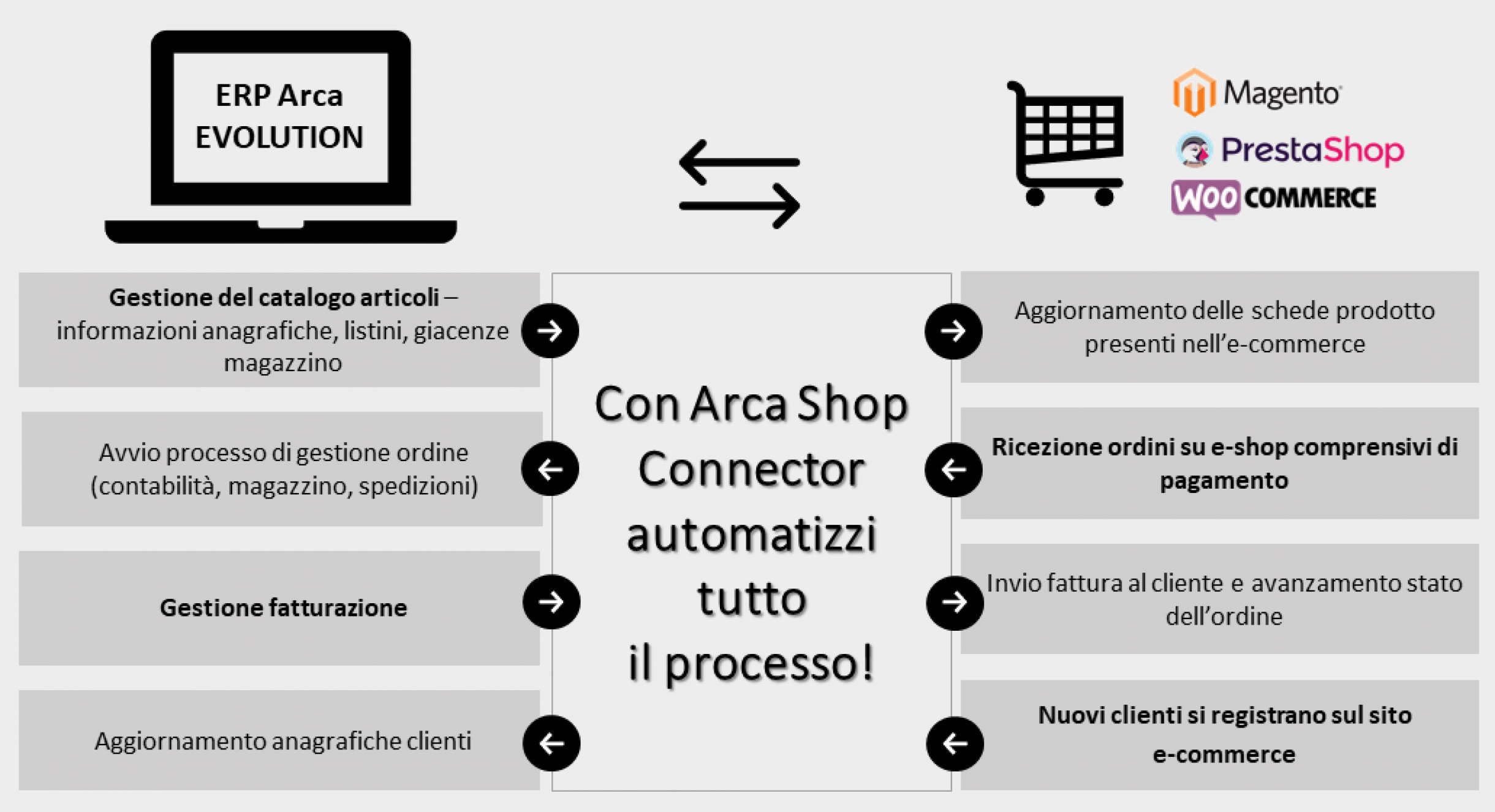 I flussi di lavoro si fanno più intelligenti. Arca Shop Connector sincronizza i dati in automatico così da ridurre la possibilità di errori di trascrizione e aggiorna in automatico le giacenze di magazzino rendendo le consegne sempre puntuali.